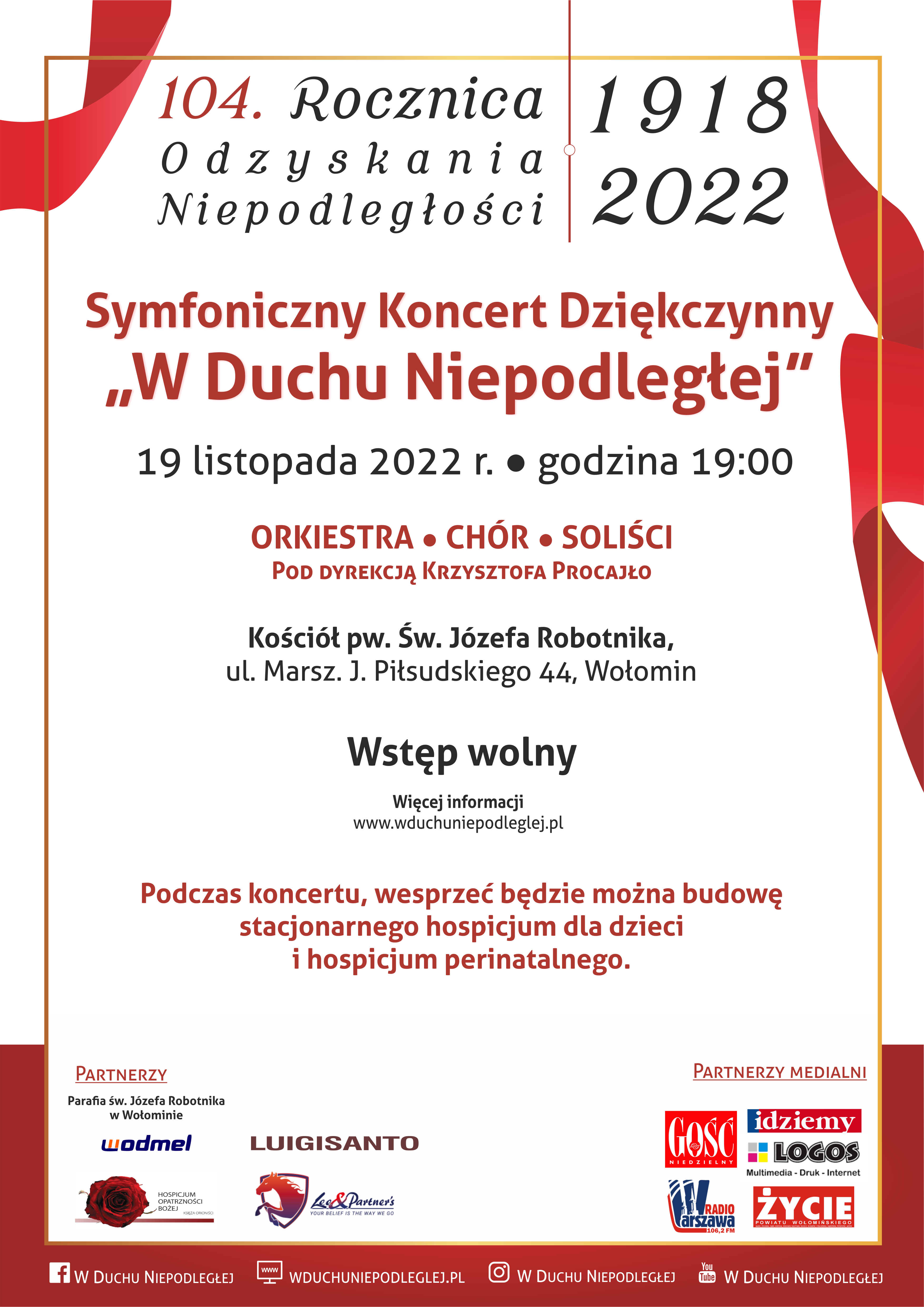 Serdecznie zapraszamy na ostatni już Symfoniczny Koncert Dziękczynny "W Duchu Niepodległej", który odbędzie się w kościele pw. św. Józefa Robotnika w Wołominie (ul. Piłsudskiego 44, 05-200 Wołomin). Podczas koncertu wykonane zostaną utwory patriotyczne, religijne oraz współczesne w specjalnie przygotowanych aranżacjach na skład pełnej orkiestry symfonicznej, chóru oraz solistów - blisko 80 osób! W programie m.in.: "Rota", "Wojenko, wojenko", "Absolve - jeśli za coś nie warto umierać, nie warto dla tego żyć" oraz "Życie choć piękne tak kruche jest". W tym roku, swój udział specjalny potwierdzili także soliści Reprezentacyjnego Zespołu Artystycznego Wojska Polskiego. Wstęp wolny.